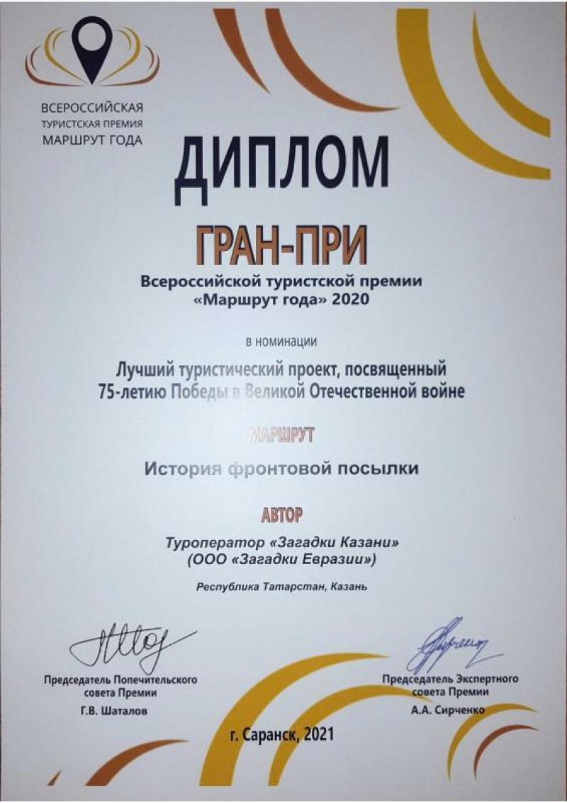 Экскурсия "История фронтовой посылки" стала Победителем (Гран-при) Всероссийской премии "Маршрут Года 2020" в номинации "Лучший маршрут, посвященный 75-летию Победы в Великой Отечественной Войне".