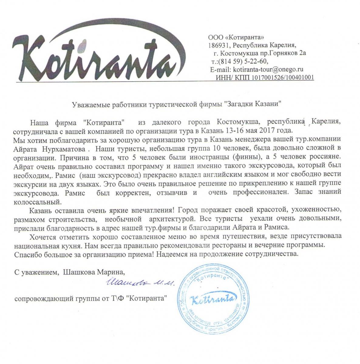 Хотим выразить огромную благодарность туристической фирме "Загадки Казани" за высокий профессионализм, интересную и насыщенную программу. Группа Нахабинской СОШ №3 находилась в Казани с 29 апреля по 1 мая. Мы восхищены работой наших гидов Жизневской Юлии и Нурхаматовым Айратом. За три дня прибывания в Казани мы с ними стали близкими друзьями.Они не только мастера своего дела, но и душевные и замечательные люди.